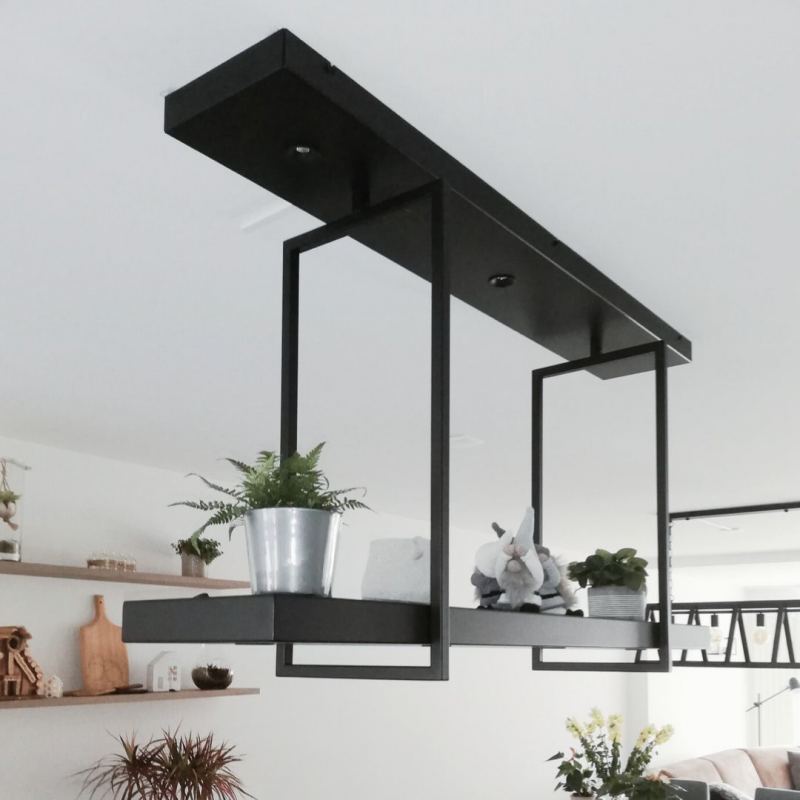Our Oslo hanging lamp is a fun and practical lamp. The lamp can, as a matter of fact, also be used to put things on it, as a design or functional table. You can, for example, put glasses, books or other accessories on it. The lamp lights up both the surface and the accessories. The lamp is manufactured of metal and stainless steel, coated with RAL 9005 structure (black).