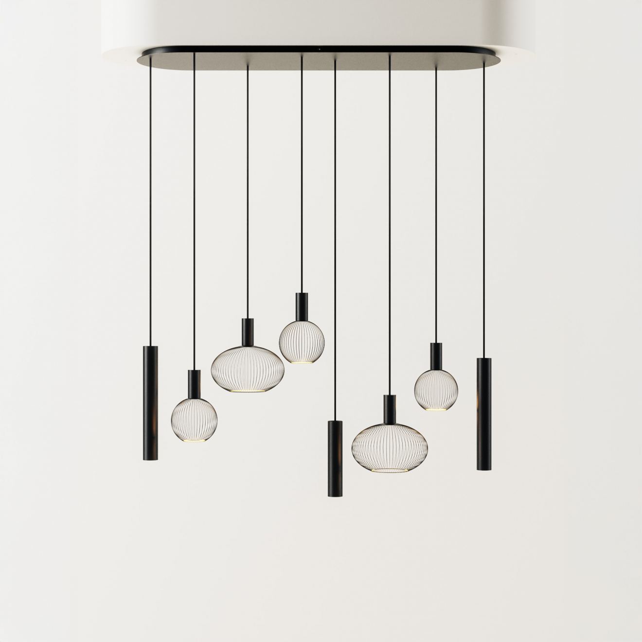 What sets Como apart is its unity of color. The entire fixture, from the ceiling plate to the cords and light sources, is finished in a single color. This gives the design a calm and cohesive character.