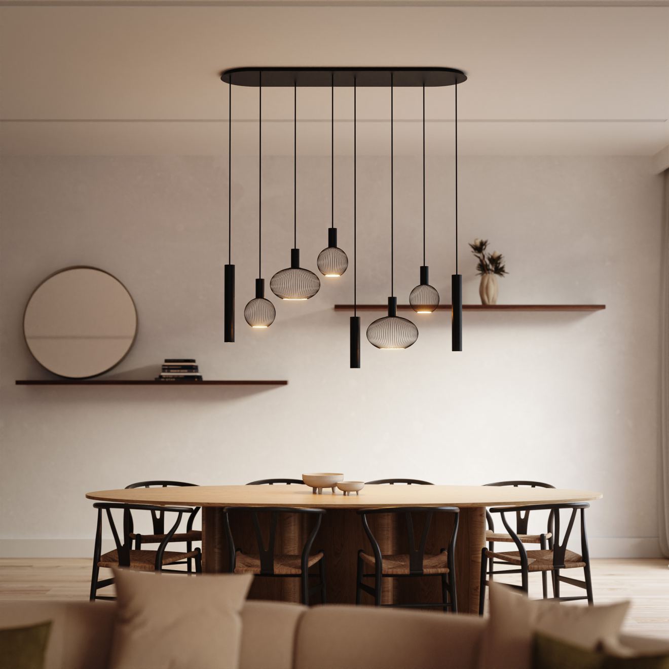 The eight light points combine direct and diffuse light. This creates a balanced light image: bright where necessary, soft in appearance. Shadows remain subtle and the light feels comfortable. Pleasant for long evenings at the table.