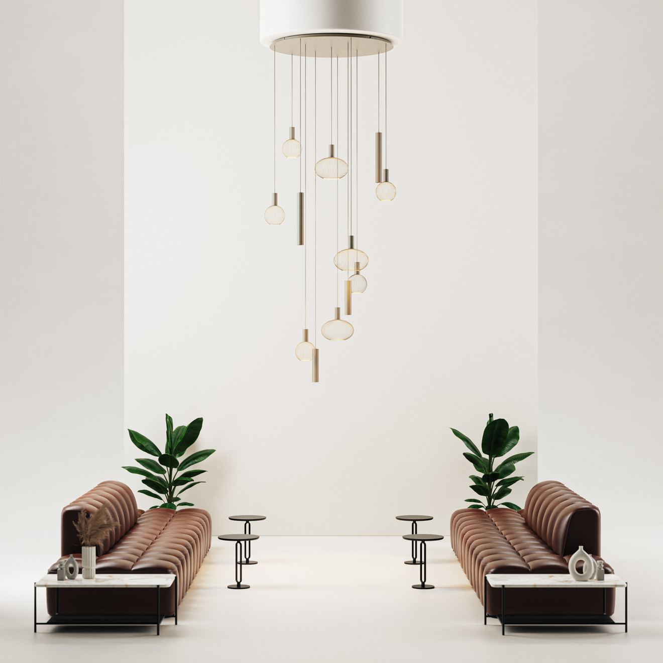 Como 9145 was developed for rooms with high ceilings. As a pendant lamp within the Como series, this model translates the recognizable design language into a larger gesture. The tubes, the clear lines, and the unity in color also give this version its modern Japandi signature.
