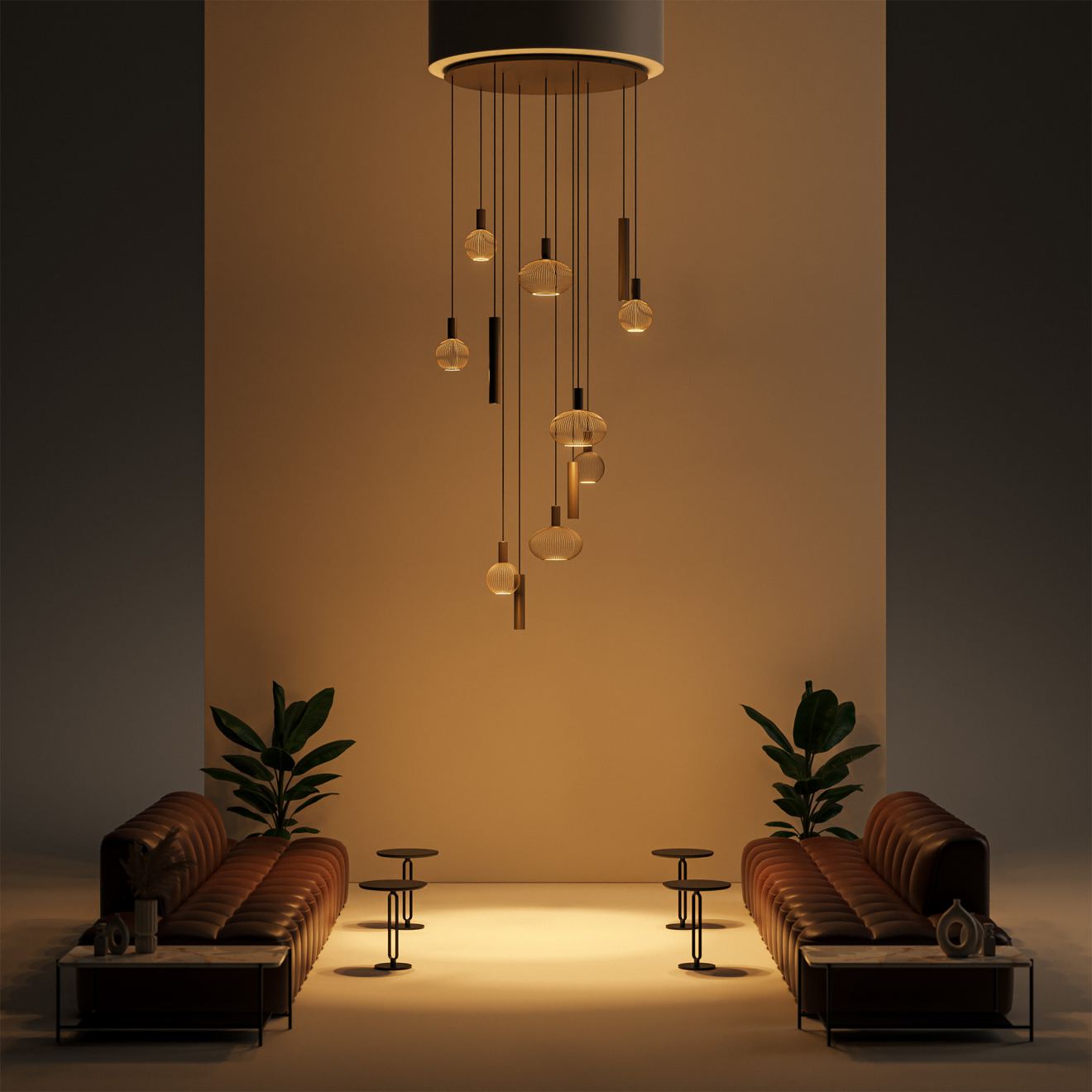 Como 9145 comes into its own in high living spaces or loft-style settings where scale and balance come together. During the day, the fixture forms an architectural element in the space, while in the evening it brings warmth and atmosphere across multiple levels.