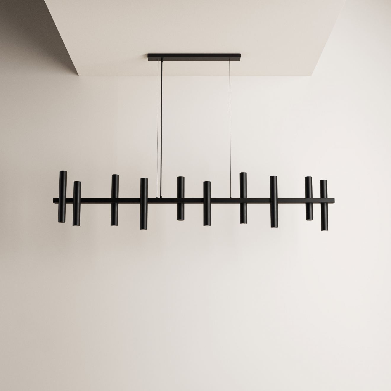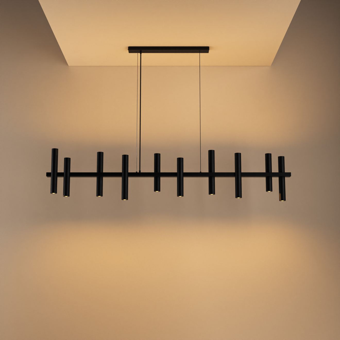The Stelvio 1302 pendant lamp from Ztahl combines sleek design with a playful look. Like the Stelvio 1300, this model consists of multiple steel tubes positioned at different heights, creating a dynamic effect. While the 1300 is 140 cm long, the 1302 impresses with its generous length of 190 cm. This allows the lamp to offer even more light points and effortlessly fill larger spaces.